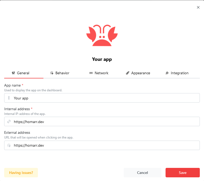 In most scenarios, you should set the internal IP address to the LAN address (this means your local IPv4 address). Homarr will use this IP to communicate with your app if needed. The external address is only used, when the user clicks on the app. Therefore, this should be something that is always reachable. If you use a domain, (Cloudflare) tunnels or a reverse proxy, you should set this to their respective hostname. Otherwise, you can use the same value as for internal address.